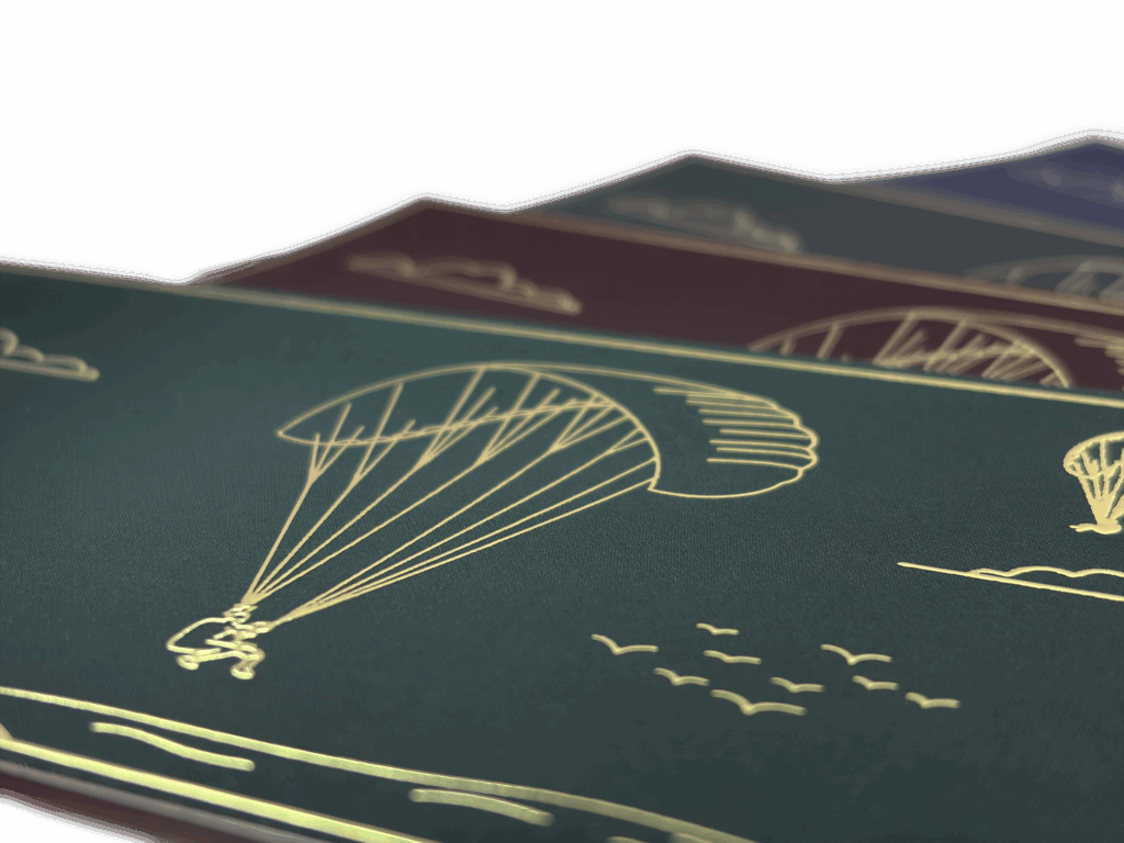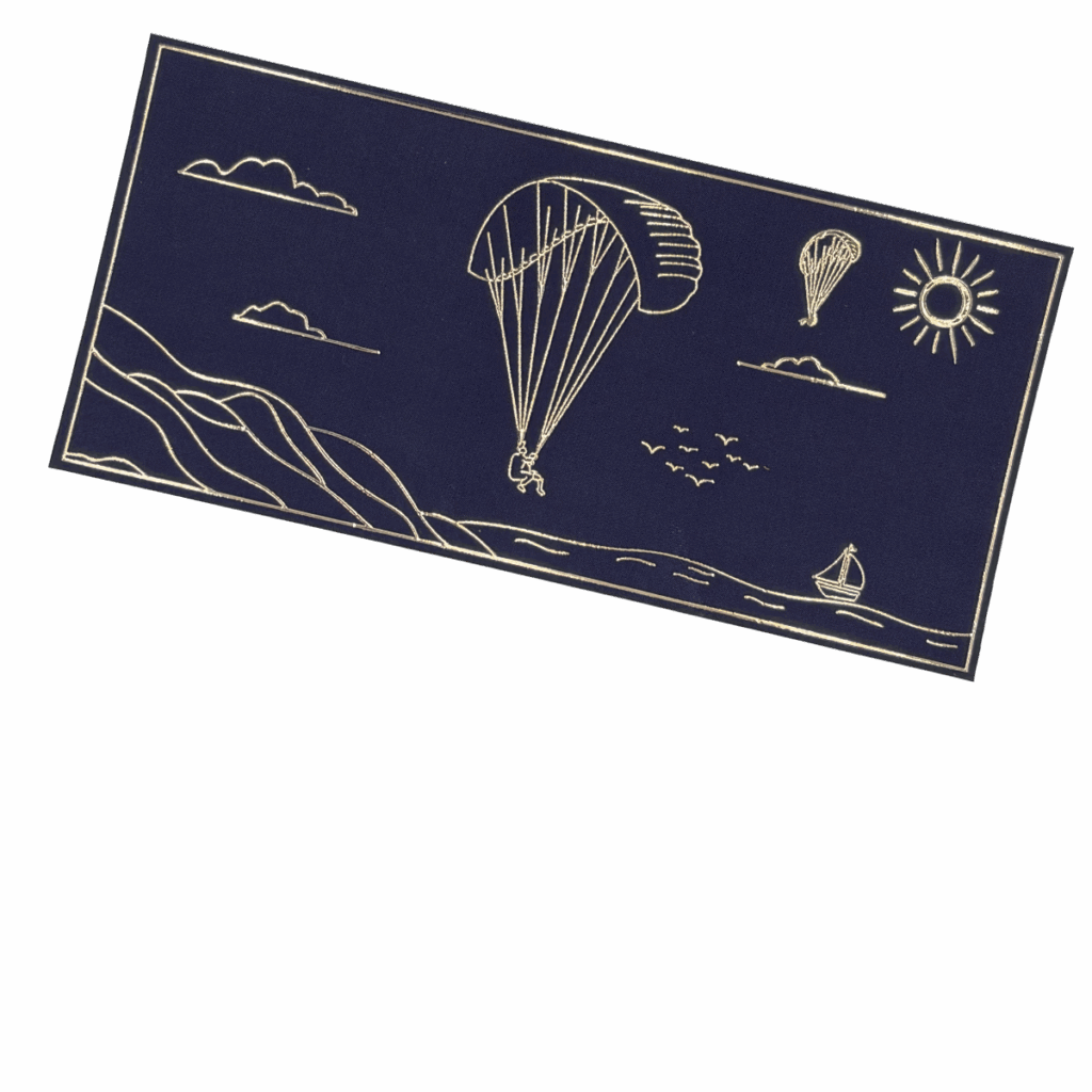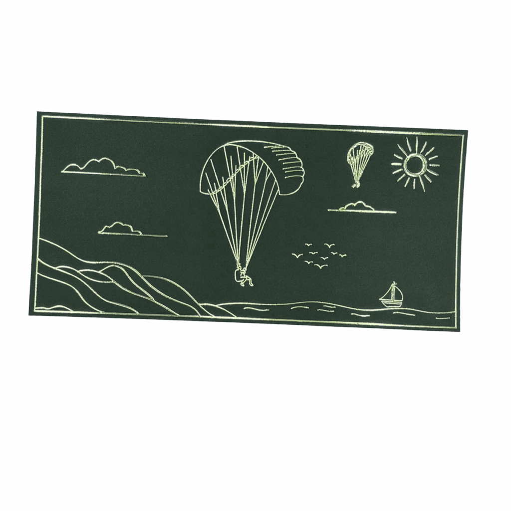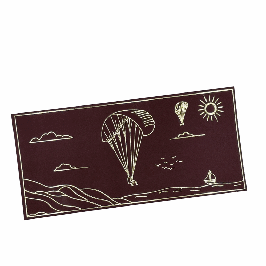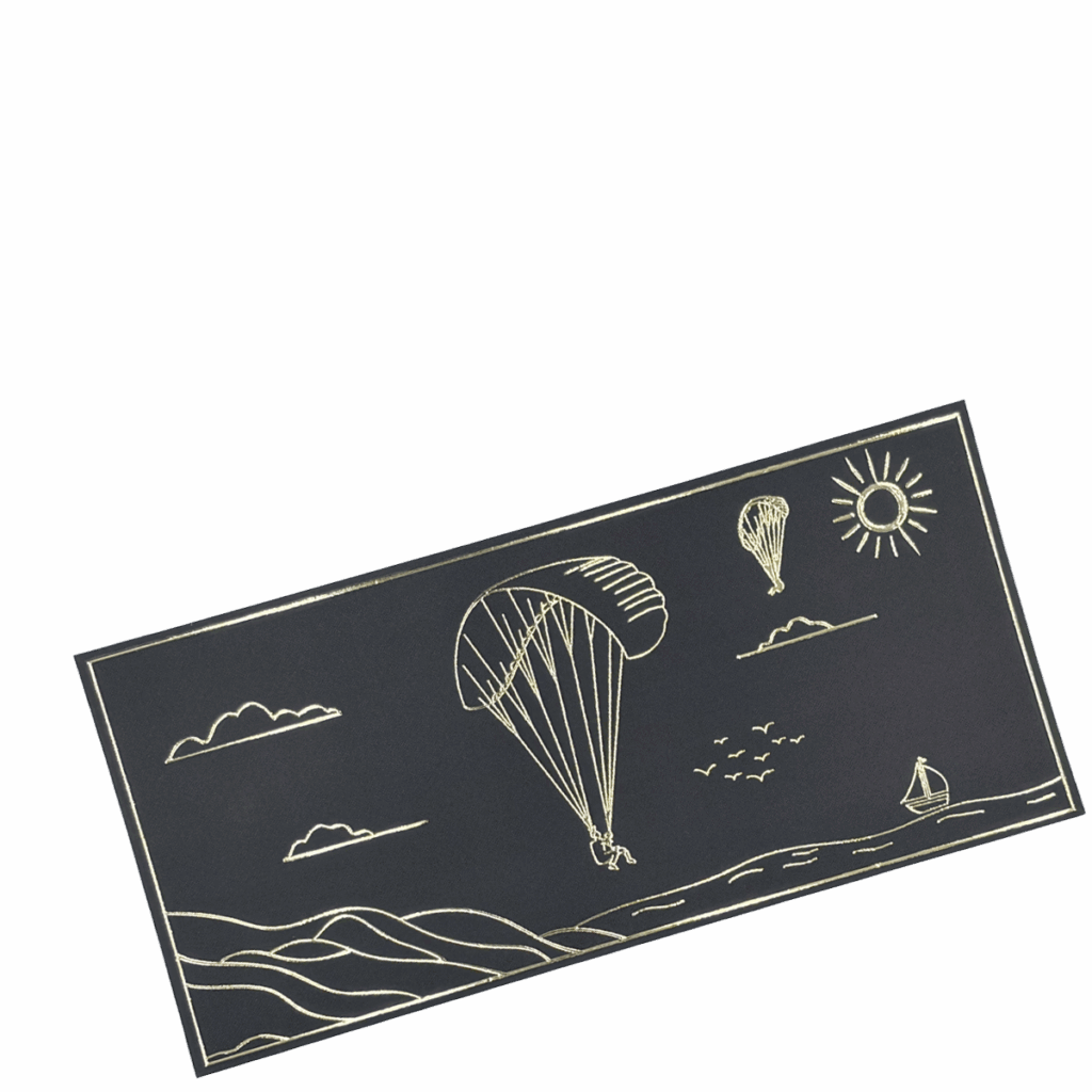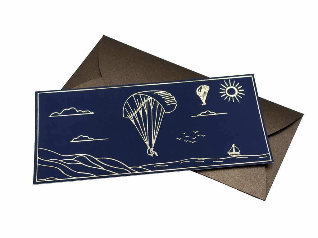 Notre carte cadeau arbore un dessin minimaliste en dorure, capturant l’instant du vol.